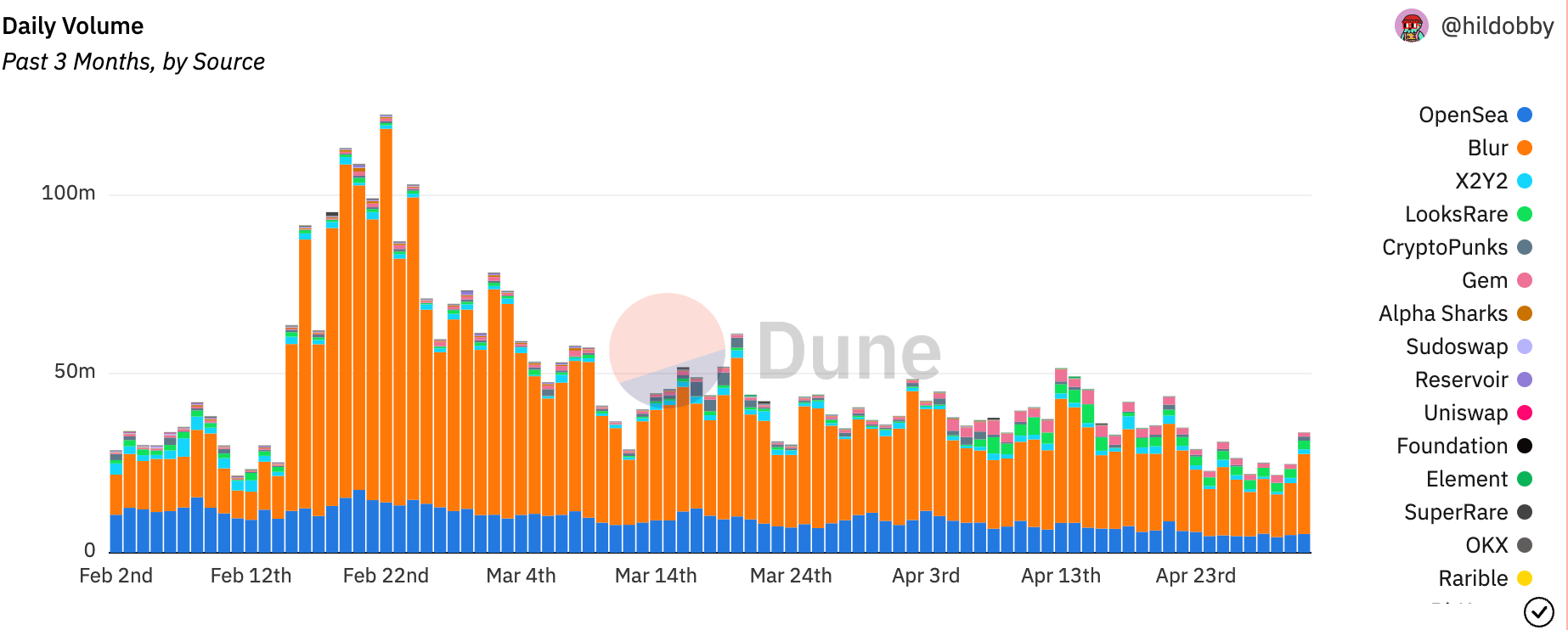 近来,加密市场出现复苏迹象,但NFT 市场依旧不见起色。根据Dune 数据显示,自NFT 聚合平台Blur 2 月14 日发行空投后,整体NFT 市场交易量开始骤降, BLUR 代币发行后交易量一度因「第二轮空投奖励计划」突破1 亿美元,而当前仅剩下不到3,000 万美元,短短两个月内已下跌近七成。