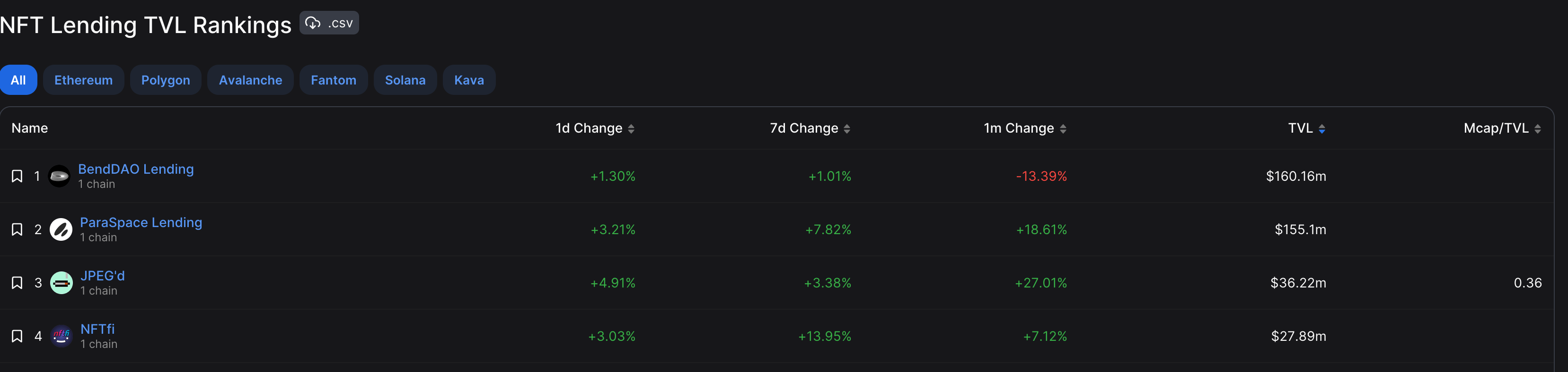 根据DefiLlama 数据显示, BendDAO 以锁仓量(TVL) 1.6 亿美元在所有NFT 借贷协议排名第一,其主要特色是作为第一个点对池(Peer-to-Pool)运行的NFT 借贷协议。