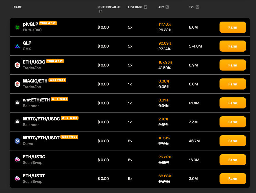 以一种非常直观的方式,用户可以简单地选择他们喜欢的农场,存入 $USDC,选择他们想要利用的杠杆——高达 10 倍——增加他们希望赚取的收益。