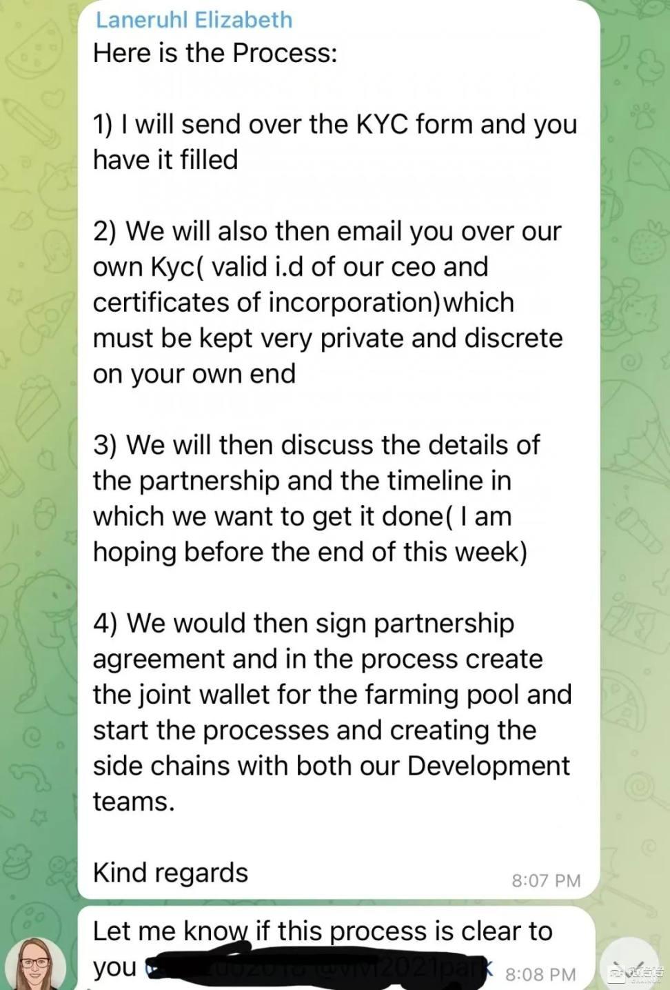 而在「Laneruhl Elizabeth」的不断催促和问询下,项目方很快将 KYC 信息和合同在 Telegram 群里提交。