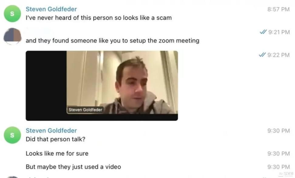而 Echo 则对为什么「Steven Goldfeder」没有进群进一步沟通提出了疑问,从始至终,除了一开始的 Zoom 会议,「Steven Goldfeder 」就在没有出现。对方解释说,「Steven Goldfeder 」并没有 Telegram 账号。
