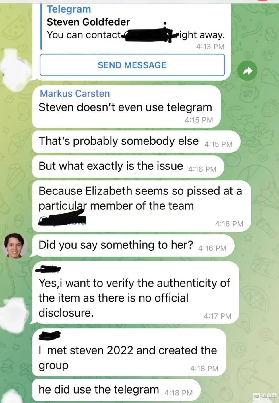 好巧不巧,作为业内资深从业者,Echo 有 Steven Goldfeder 的 Telegram 联系方式,而在 Echo 将真实的账号发到群里之后,所谓「Arbitrum 团队」在群里的另一位名叫「Markus Carsten」工作人员却矢口否认,并表示这可能是别人。