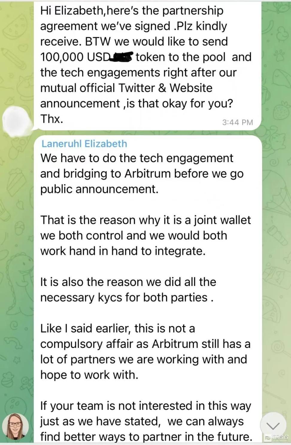 在看过白皮书,核实了基本的合作信息后,双方在 Telegram 组建了合作群。负责「ArbiFarm」项目的对接人,使用名叫「Laneruhl Elizabeth」的账号,头像是一个白人女性。她表示,希望双方能够约一个线上会议来探讨下未来合作,「Arbitrum 的全球 CEO Steven Goldfeder」将参与到会议中。