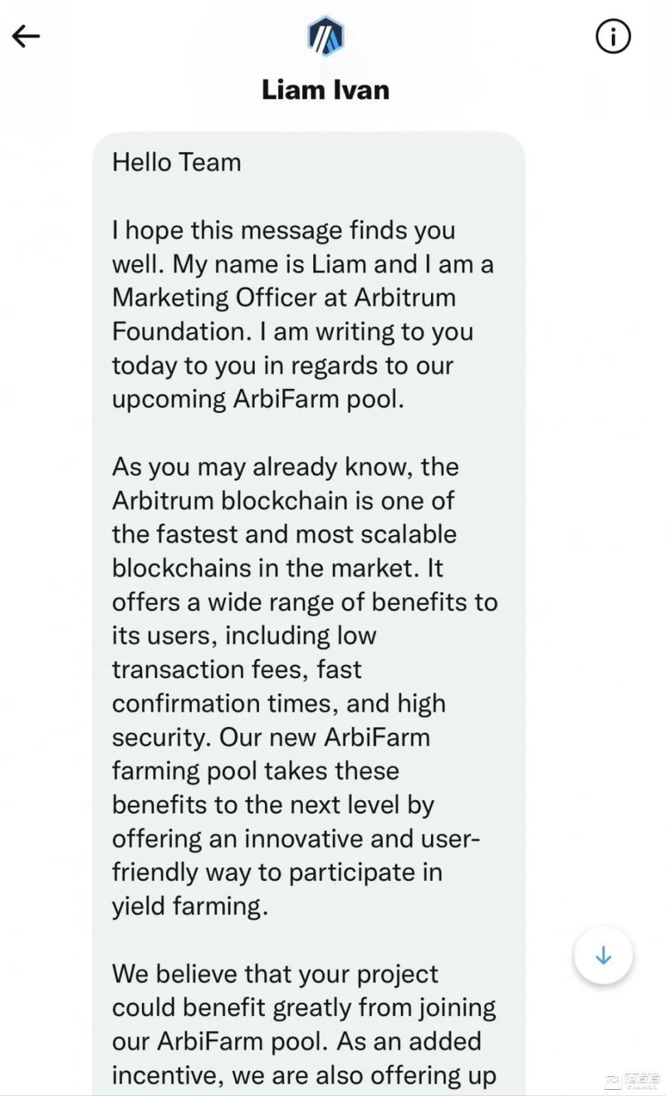 「你好团队,我是 Arbitrum Foundatoin 的 Marketing Officer,我们即将推出 ArbiFarm 矿池...我们相信您的项目可以从加入我们的 ArbiFarm 池中受益匪浅...」