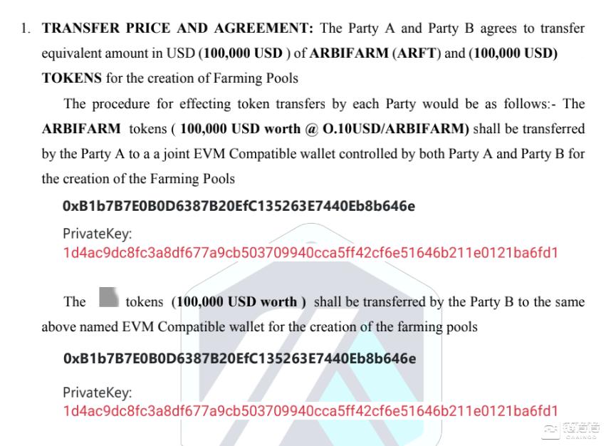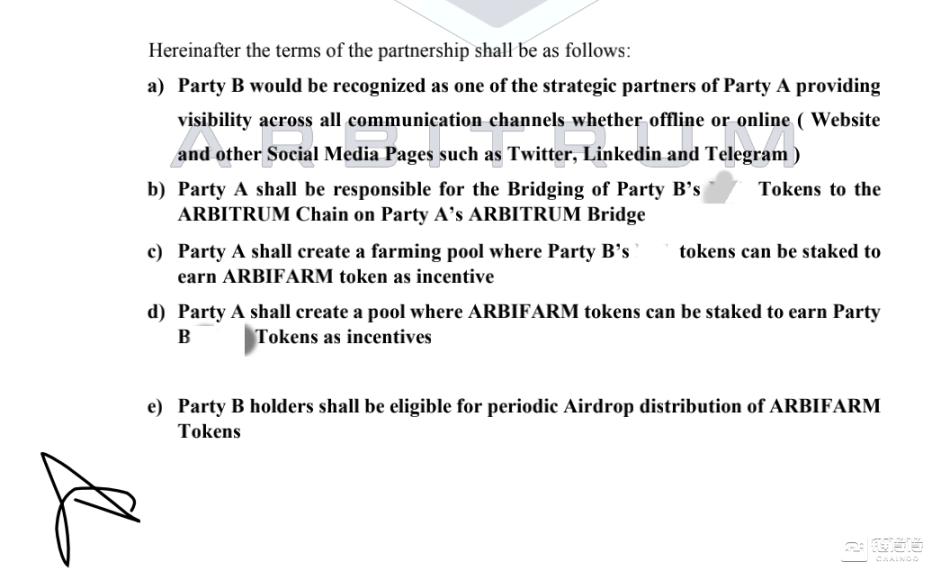 该会议结束后,「Laneruhl Elizabeth」便立刻推动合作合同签约进展。很快在 Telegram 群中发了合同,其中提出双方共建「ArbiFarm」。双方各出资 10 万美金代币,「Arbitrum 注入 ARFT」(ArbiFarm 代币),项目方注入治理代币,跨链到 Arbitrum,双方共同控制的 EVM 多签钱包中,用于创建 pool,来共同联合质押挖矿,共同管理。