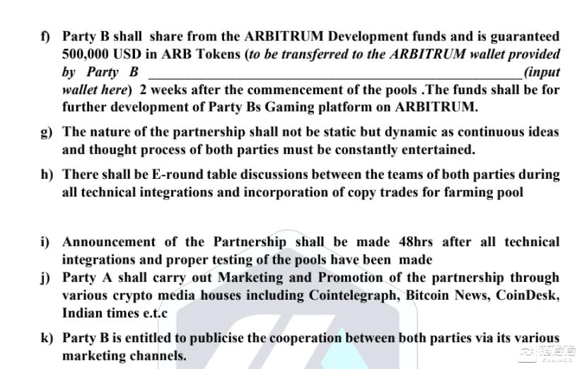在合同里还特别提到,甲方(「Arbitrum」)将负责乙方(项目方)的资金跨链,「Arbitrum」愿意提供质押奖励,在技术对接的两周内,提供 50 万美金等值 ARB 的 Grant 来推动游戏平台在 Arbitrum 的建设。(截止发稿,ARB 在 CoinMarketCap 报价 1.22 美元。)