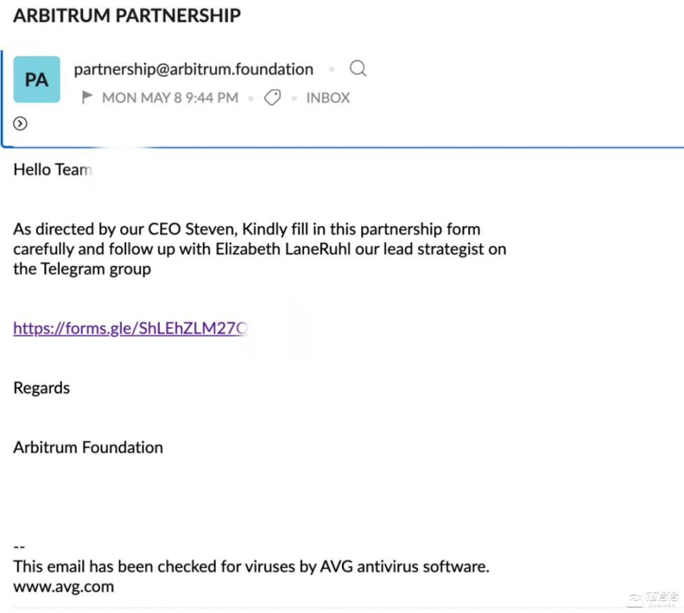通过 partnership@arbitrum.foundation 官方地址发送的官方合作邮件