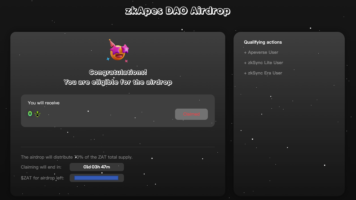 近期土狗项目火热,继迷因币$AIDOGE 和$PEPE 引爆市场后,以太坊二层区块链网路zkSync 上的生态项目zkApes 于本月10 日宣布发放$ZAT 代币空投,领取规则是在5 月1 日前曾交互过zkSync Lite 和zkSync Era 主网的地址,抑或是zkApes 项目的使用者,就能够获得空投。