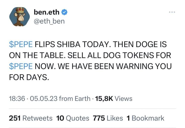 随着 PEPE 崛起和 memecoin 狂欢季到来,Ben 一改往常,他开始频繁发推文,并不停推销 memecoin。