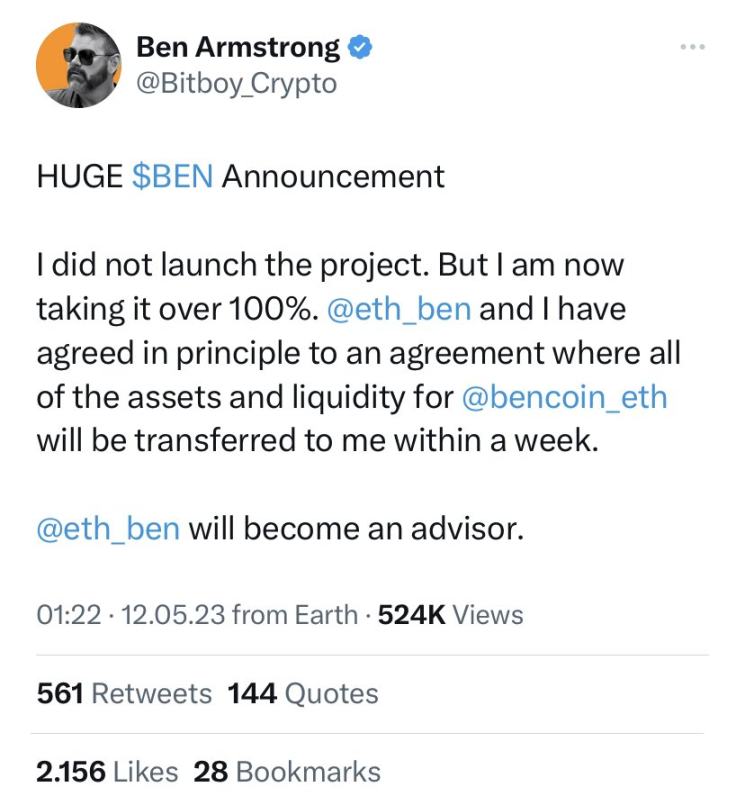 尽管 Ben 曾承诺 BEN 是他一生的项目,但他还是在不到 72 小时后便将其交给了 Bitboy。
