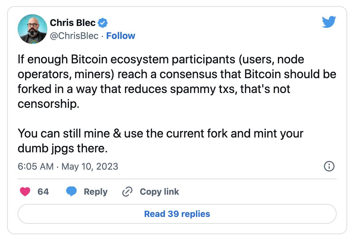 “在我看来,任何试图禁止或审查这些交易的尝试都比让它们存在更加攻击比特币。它们符合共识规则,当一小部分人想要改变规则以阻止他们不喜欢的事情时,这才是真正的攻击。”