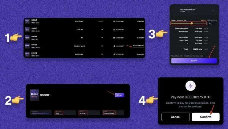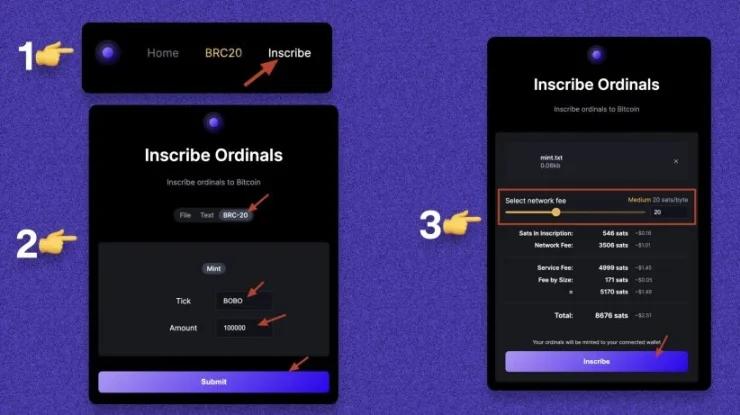 1.转到 BRC-20 列表,查看每个代币供应量下的进度条。(如果进度条不是 100% ,那么您可以铸造该代币)。2.点击代币>>检查详情>>铸币。3.设置费用>>铭文。4.确认交易。