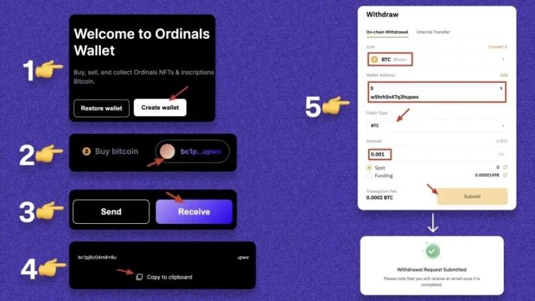 1.下载并创建钱包:ordinalswallet.com2.点击您的钱包个人资料。3.点击「接收」。4.复制钱包地址。5.前往任何支持 taproot 的交易所并将一些 BTC 提现到此地址。(Binance、Bybit 等)