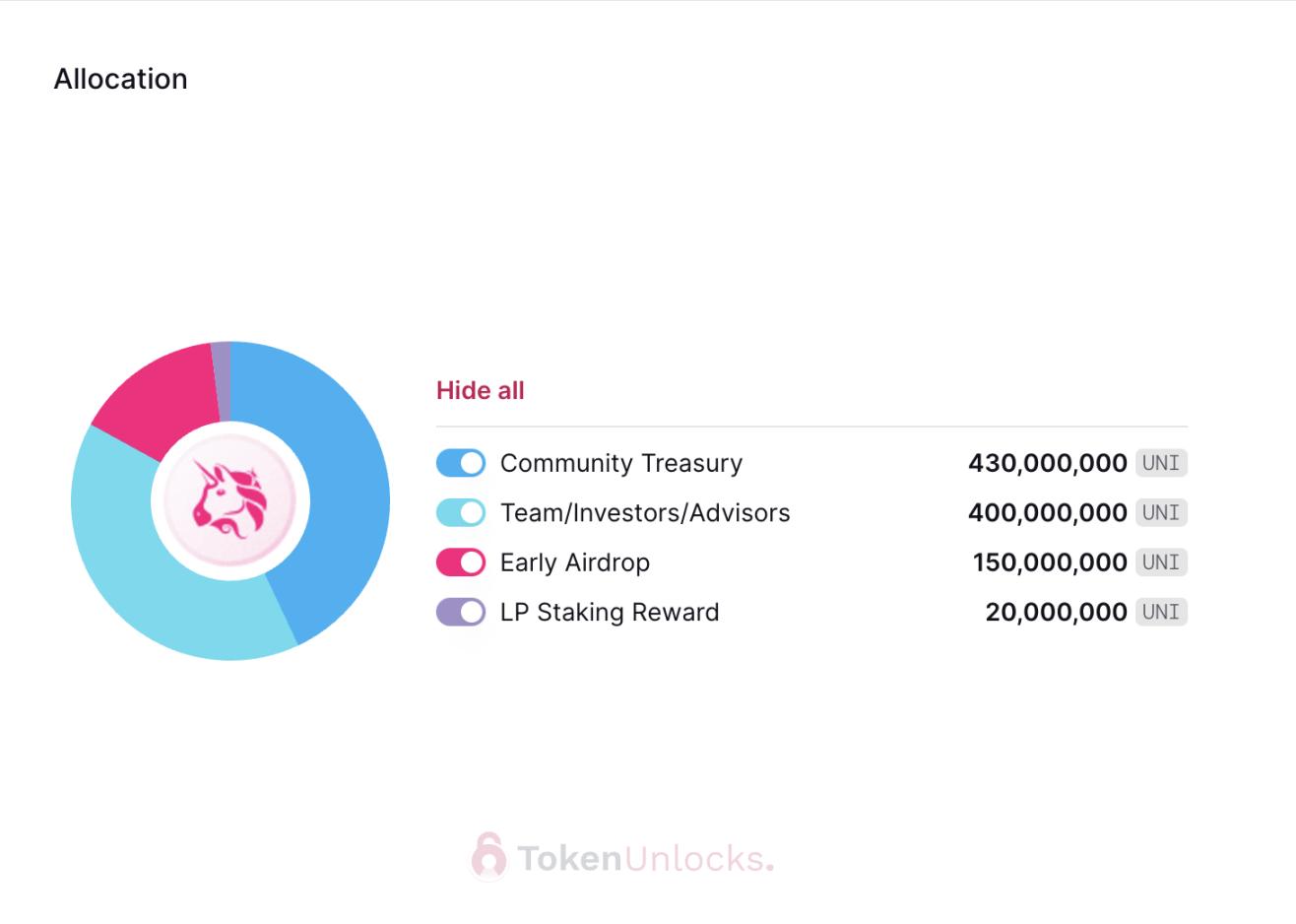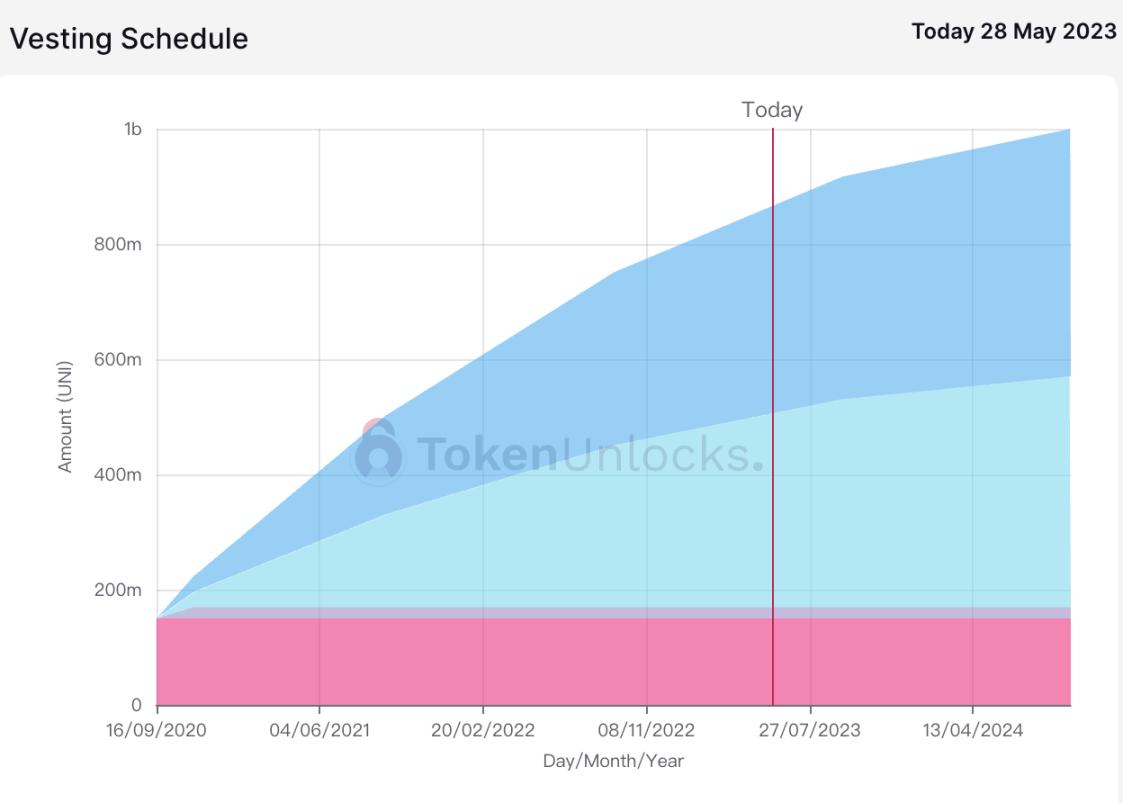 Uniswap 代币 UNI 每日解锁 454,795 枚(约 236 万美元),包括「社区财库」与「团队 / 投资人 / 顾问」。目前,UNI 代币仍有 13.44% 未解锁。