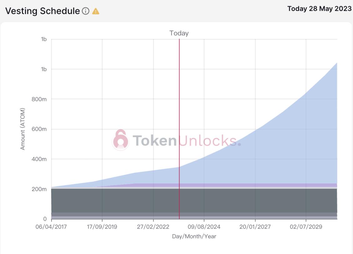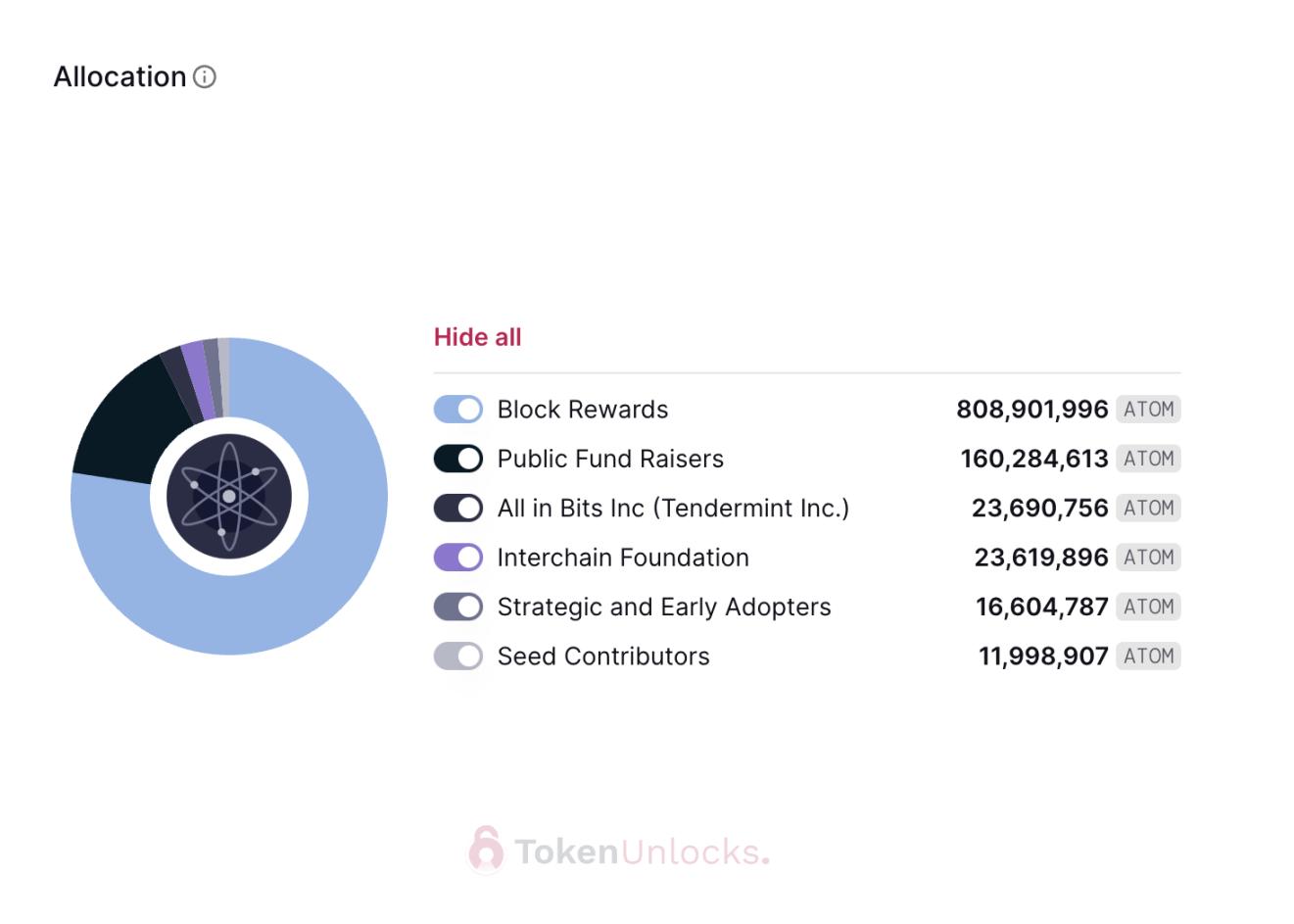 Cosmos Hub 代币 ATOM 的「Block Rewards」部分每日解锁 148,369 枚(约 158 万美元)。