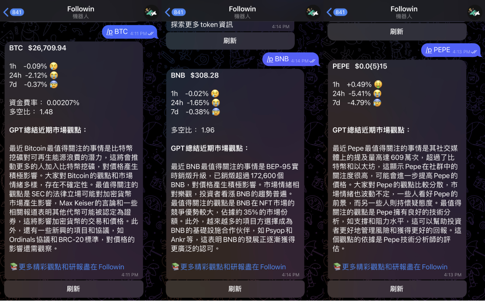 币圈最重要的莫过于消息面了,使用指令 /p [代币] ,就可以直接查询代币的涨跌幅、资金费率、多空比、AI 分析近期市场观点!比如说我想搜寻 Bitcoin 的近期观点,我只要在 Bot 页面打上 /p BTC,机器人就会马上传给你市场观点!立即加入: https://t.me/Followin_alpha_bot