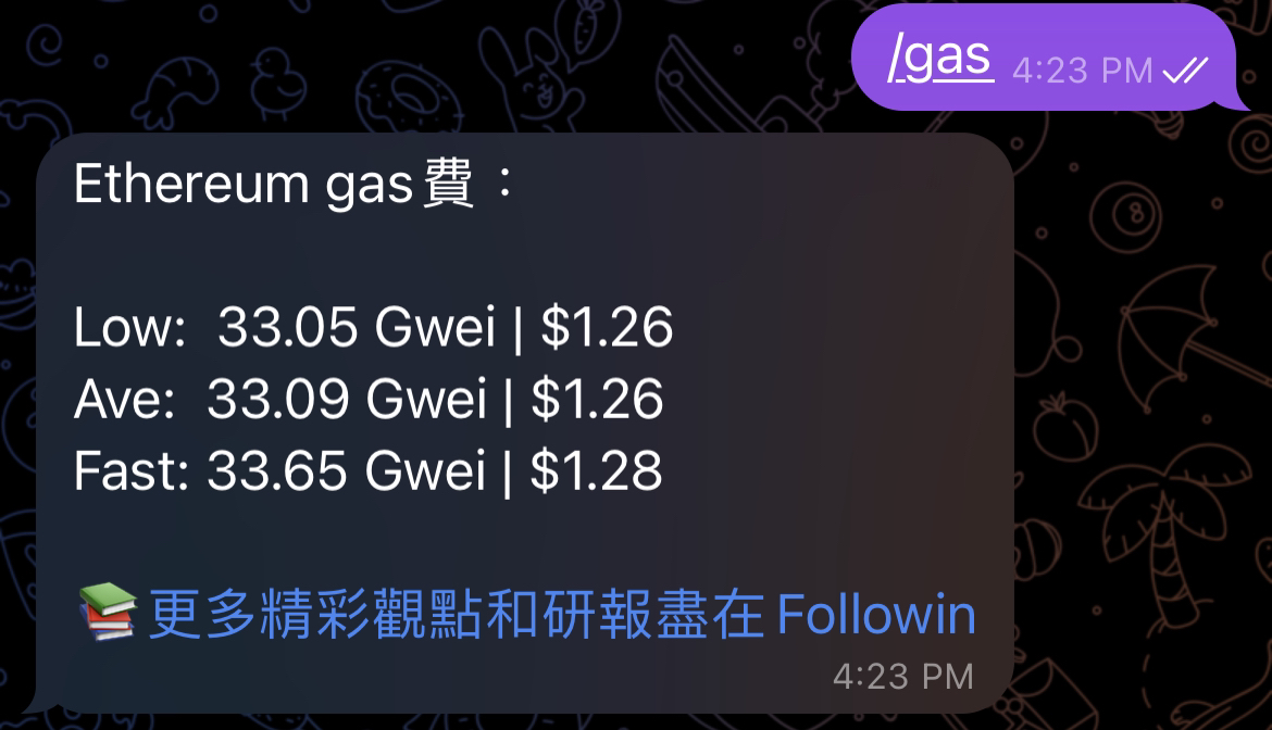 不管您是 NFT 交易者或是噜空投的伙伴,有在玩一级市场的朋友,一定超级需要这个功能!只需要在Bot内打上 /gas ,就可以马上查到最新的瓦斯费价格,让你把握最好的时机交易!立即加入: https://t.me/Followin_alpha_bot