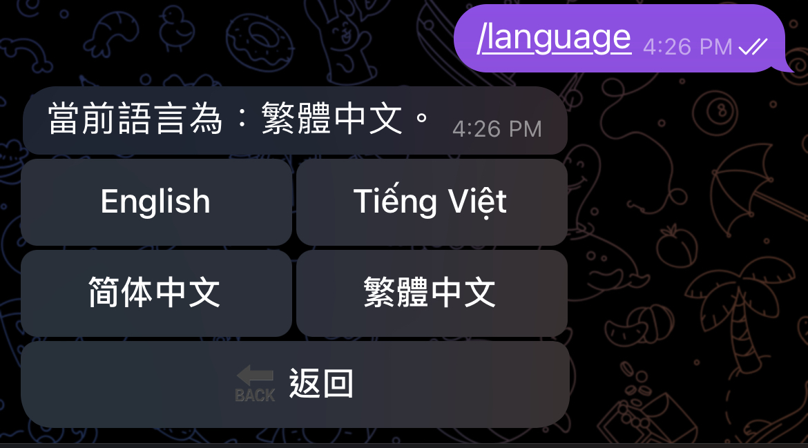 Followin Bot 目前支援了四种语言,包括「英文」、「越南语」、「简体中文」、「繁体中文」,目前也正在紧锣密鼓的支援更多语言!让这个机器人可以帮助到更多的伙伴!
