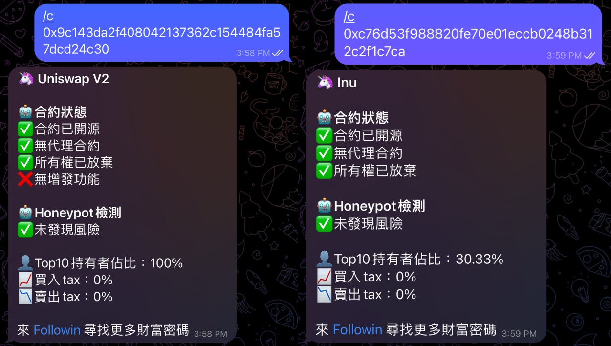 在币圈一级市场冲土狗,最怕的是遇到貔貅盘,购入后因合约存在后台,项目方可以轻易将流动池转移、设定购入后无法售出,但每购买一次币都要去查看所有合约的话又非常麻烦,Followin Bot 整合智能合约检测功能,只需要打上 /c [智能合约地址],Followin Bot 就会自动侦测目前风险、合约是否开源、大户持有占比、买卖税…等,冲土狗必备神器!