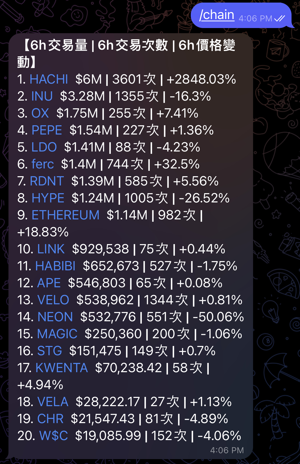 不知道要怎么追踪新币种吗?Followin Bot 实时追踪 6 小时内的大额交易量、多次交易次数、价格大波动的一级市场币种,多交易额、次数,也一定程度的代表这个代币的热门程度,下次挑选币种,不访来 Followin Bot /chain 看看吧!