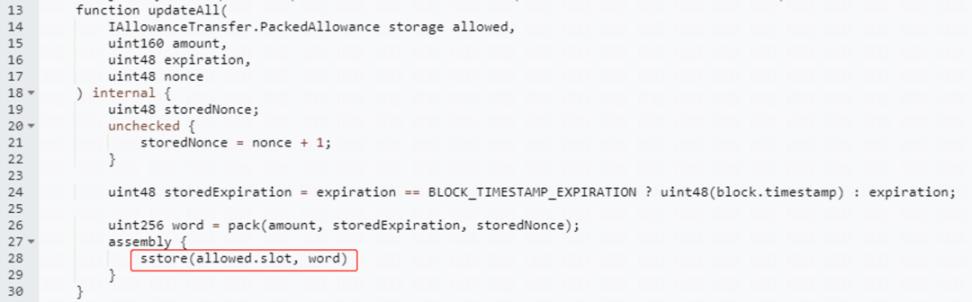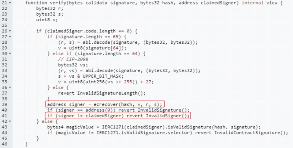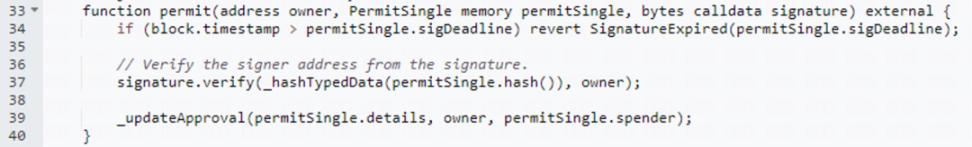 可以看到,verify 函数会从签名信息参数中获取出 v、r、s 三个数据,v、r、s 是交易签名的值,它们可以用来恢复交易签名的地址,上图代码中可以看到,合约恢复了交易签名的地址后,与传入的代币拥有者地址进行比较,如果相同,则验证通过,继续_updateApproval 函数的调用,如果不同,则回滚交易。