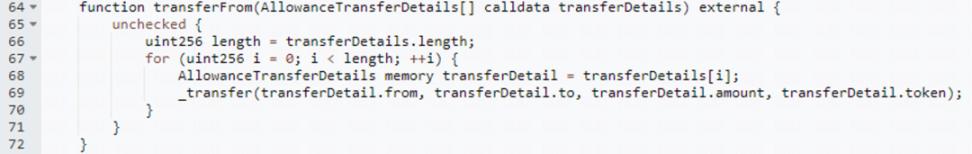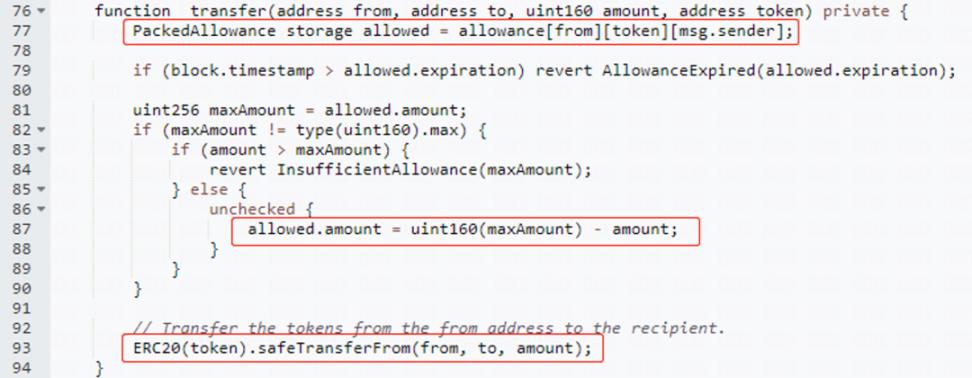 当通过了签名校验后,会调用_updateApproval 函数更新授权值,这也就意味着你的权限发生了转移。此时,被授权方便可以调用 transferfrom 函数将代币转移到制定地址,如下图代码。