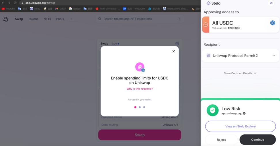 明白了 Permit2 合约,回到小 A 的事件中我们就明白了为什么资产被盗都是与 Permit2 合约进行交互了,那么就让菠菜来重现这个 Permit2 签名钓鱼手法,首先一个至关重要的前提条件是被钓鱼的钱包需要有 Token 授权给 Uniswap 的 Permit2 合约,菠菜发现目前只要在与 Permit2 集成的 Dapp 或 Uniswap 上进行 Swap 的话,都是需要授权给 Permit2 合约的(下图菠菜使用了安全插件)。