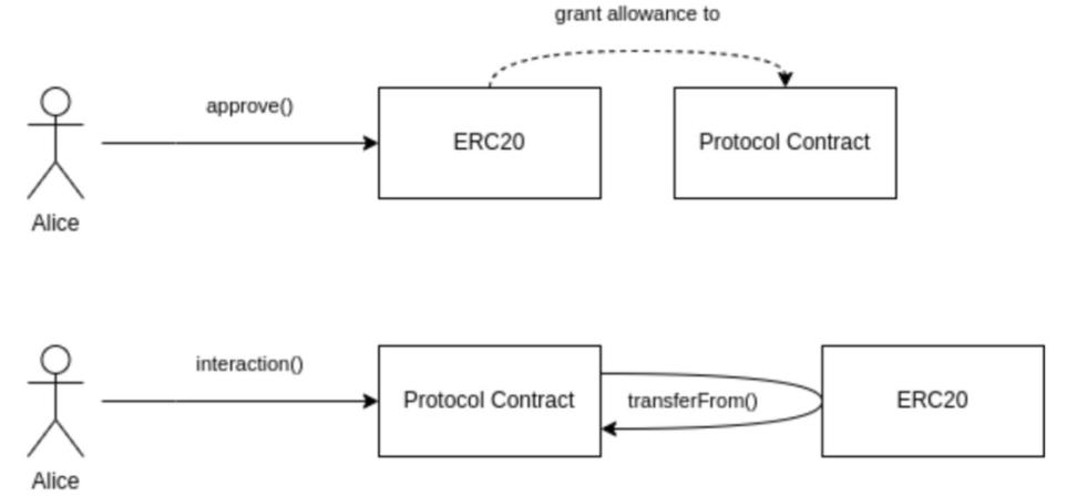 首先我们需要知道,要想成功调用 Transfer From 这个函数的前提是调用方需要拥有这个 Token 的额度权限,也就是 approve,相信大家有过链上操作的一定熟悉不过了,当我们去使用一些 Dapp 的时候,一旦涉及到资产的转移就需要我们先进行一个授权(approve)操作,这样 Dapp 的合约才有权限对我们的资产进行转移。