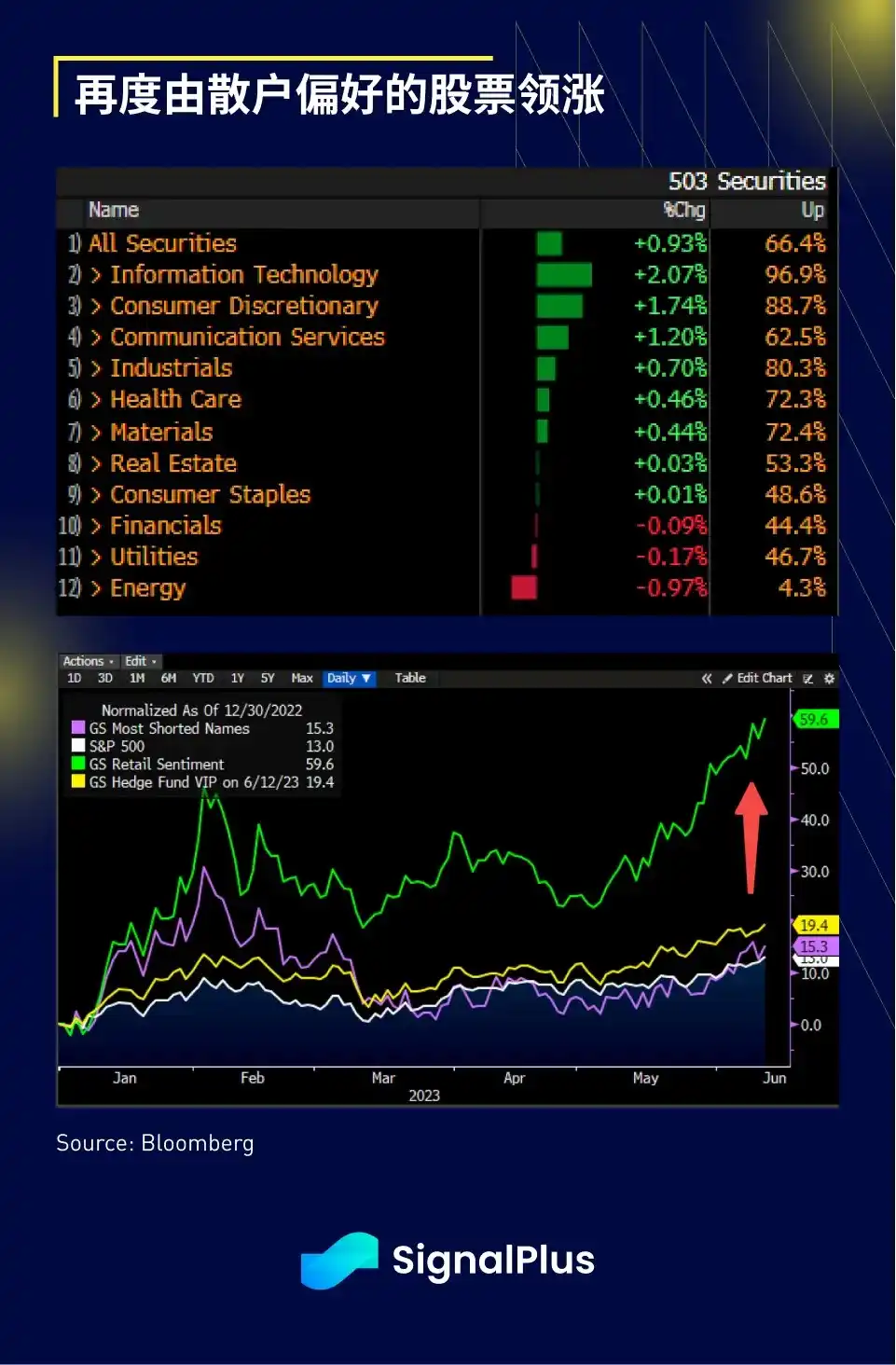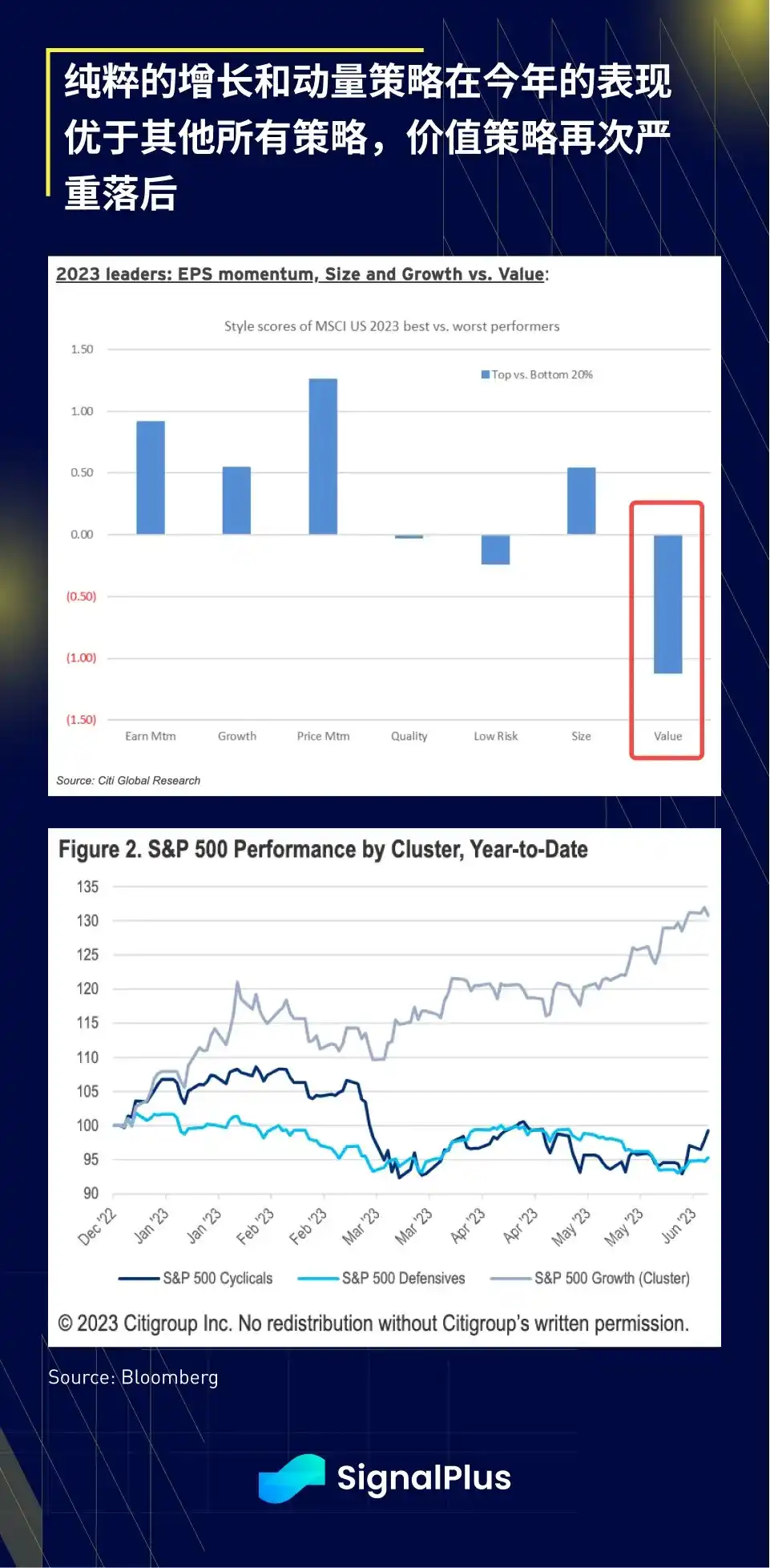 专业经理人今年的表现则相对较差,传统的「价值」策略和对宏观敏感的周期性和防御性股票等表现大大低于纯粹的增长和动量策略,考虑到对区域性银行问题的担忧、令人失望的中国数据、持续的地缘政治紧张局势以及房地产和其他利率敏感资产的市值亏损,当前风险情绪急剧升温确实令人惊讶,不过市场总是倾向往给大部分参与者带来最大痛苦的方向前进。