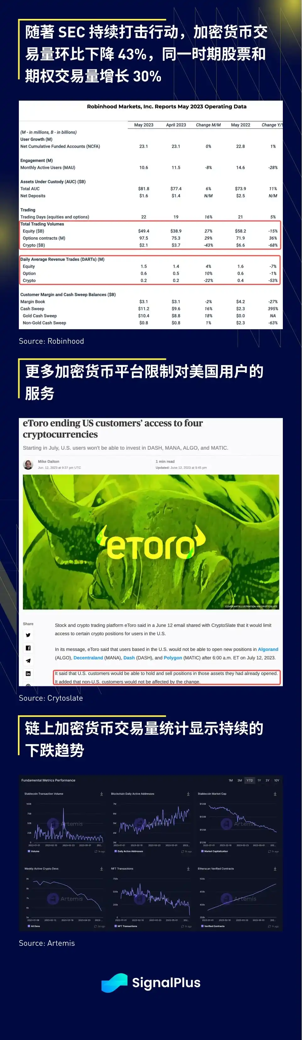 在数字资产方面,随著越来越多在美国运营的平台限制美国用户的访问,加密货币的清算仍在继续,此外,Robinhood 运营统计数据显示,随著 SEC 打击力度的加大,加密货币交易量环比暴跌 43%,而同一期间股票现货和期权交易量增长了近 30%,同时,随著整体活动和稳定币数量继续下降,链上分析数据也出现较负面的结果,考虑到前景不佳,BTC 和 ETH 在这种背景下仍能维持其价格,其实是相当令人难以置信且令人振奋的。希望大家都能继续注意安全!