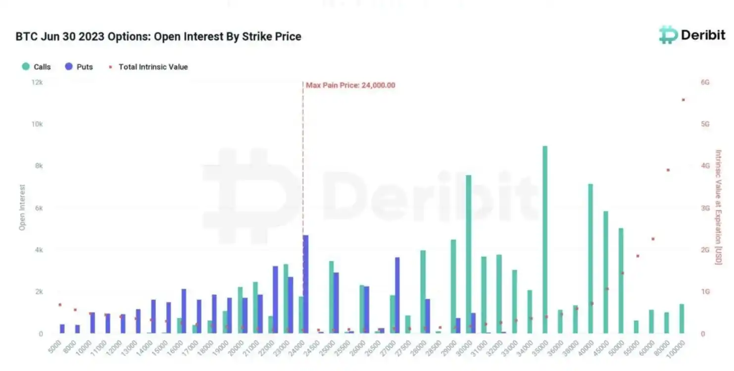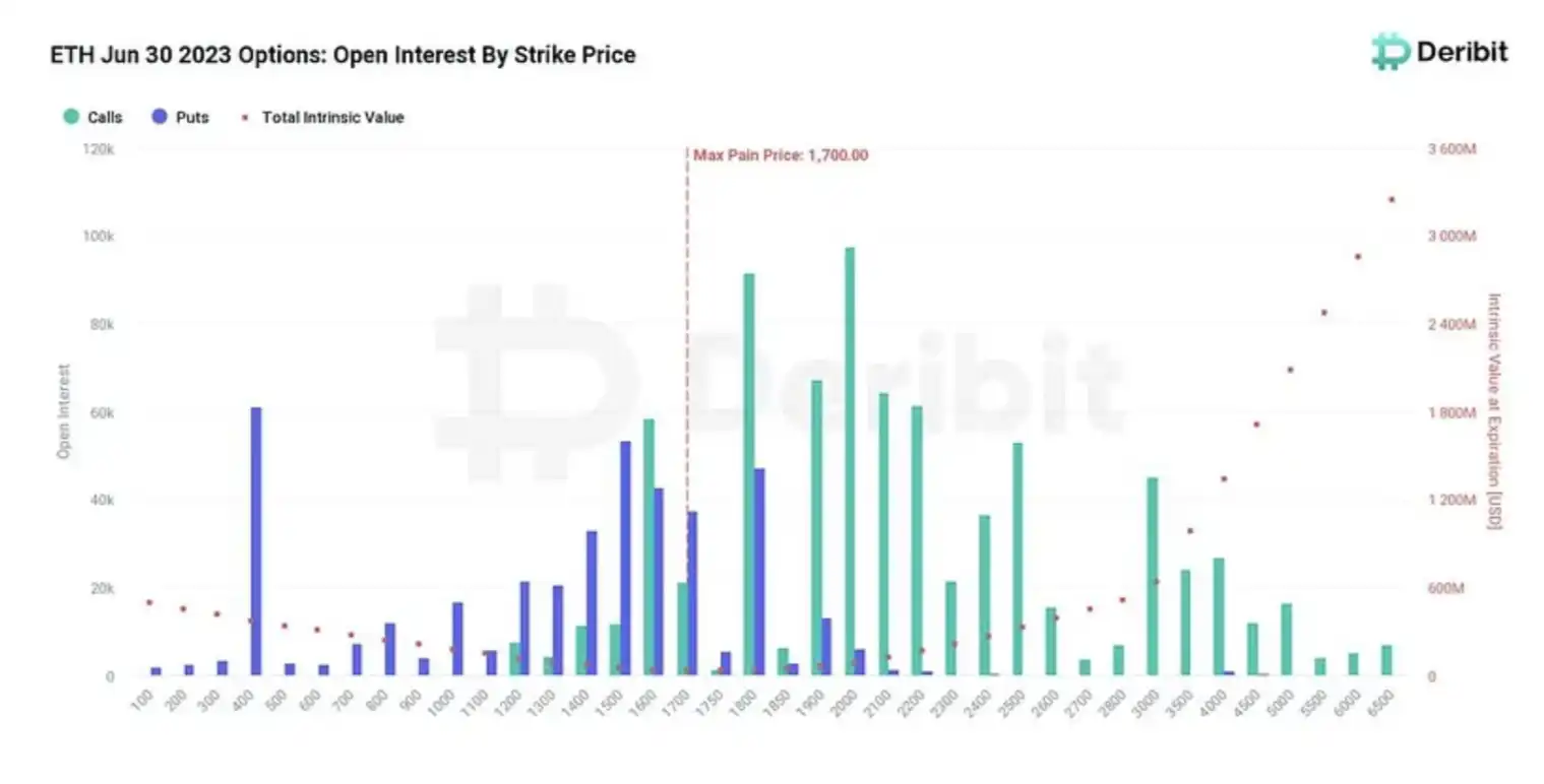 Deribit6 月底交割期权,BTC 最大痛点 24000 不过下面曲线比较平,看 25500 的内在价值跟 24000 也差不多。ETH 最大痛点 1700。看期权数据,这个月现货价格也就这样了。