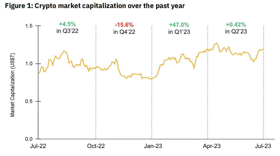 全球最大加密货币交易所币安其研究院近期发布 2023 年中报告,截至 2023 年 6 月 30 日,总加密货币市场市值按年增长 30.3%,达到 1.17 兆美元,相比一年前的 9,000 亿美元有所增长,代表著在经历了 2022 年加密货币市场的风风雨雨后,市场正在经历值得关注的复苏期。