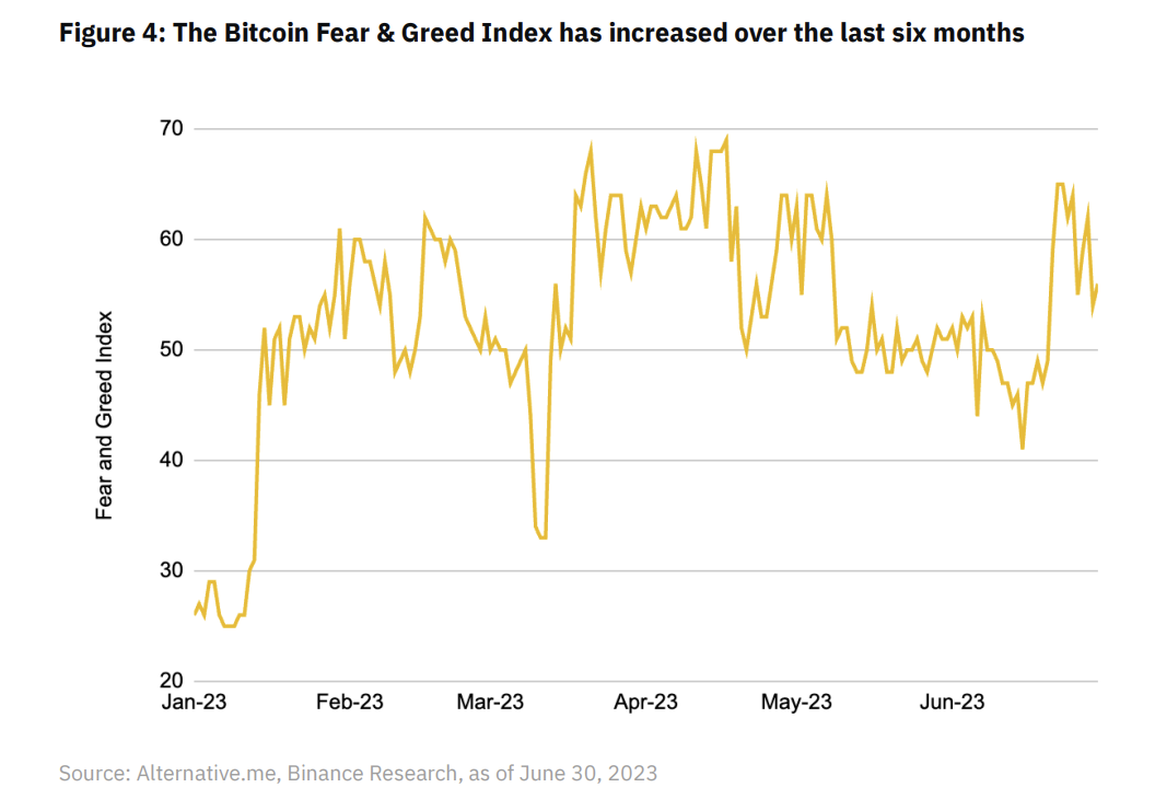 接著关注到比特币恐惧与贪婪指数,此指标衡量市场对比特币等大型加密货币的态度和投资者心理,使用包括市场份额、交易量、Google 搜索趋势、社交媒体情绪、价格波动等等数值计算,从过去六个月的波动来看,整体从 20 附近的水平增加到中间值 50 的水平,币安解读市场对比特币持有正面看法。