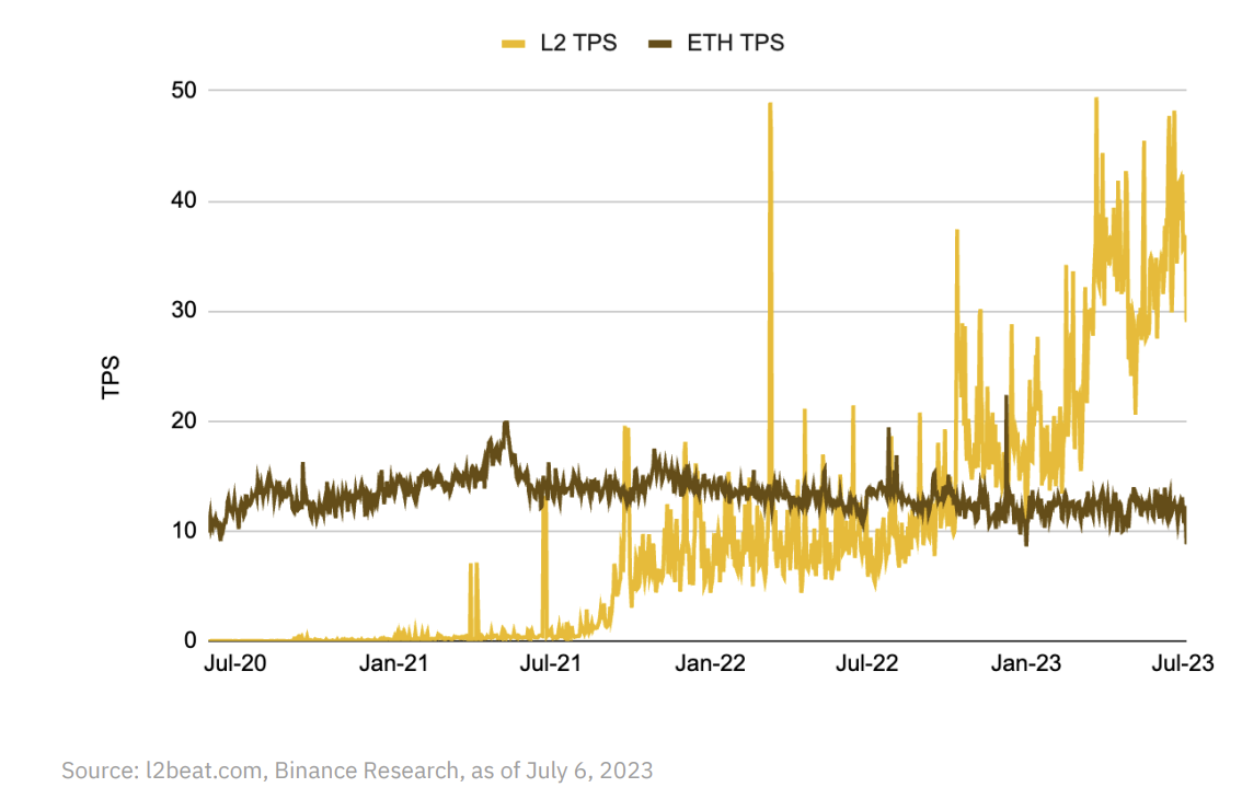 具体公式是(L2交易数+ETH交易数)/ ETH交易数,根据截至 2023 年 7 月 6 日为止过去七天的数据,这个数字是 4.19 倍,即在以太坊上完成的交易数比没有 L2 解决方案时多了 4.19 倍。截至撰写本报告的时间,L2 的平均每秒交易数为 37.6,而以太坊的平均每秒交易数为12.6。