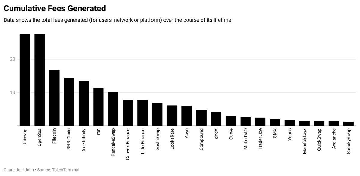 这其中有一个原因。dApps 倾向于通过捕获其上的交易的一小部分来赚钱。你的费用与通过产品流动的资本量和你的收费比例成比例。Uniswap 和 OpenSea 之所以能够赚取近 28 亿美元,是因为它们具有较高的货币流动速度(资产更迭的频率)和可执行的收费比例,将价值传递给用户。