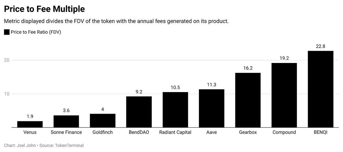 对于许多 DeFi 项目来说,这意味着能够更改费用变量、支持的资产和涉及财务的其他随机功能。在这种情况下,代币持有者从产品中不会获得收入,但他们持有的代币「管理」着可能获得收入的金库。因此,如果一个产品为用户创造了一亿美元的费用,那么在考虑公平估值时,基于这一数字的倍数是相关的。Compound 和 Aave 的市盈率与我们在上市的金融科技公司中看到的情况相一致。市场在短期内受到叙事的驱动,但随着时间的推移会回归理性。