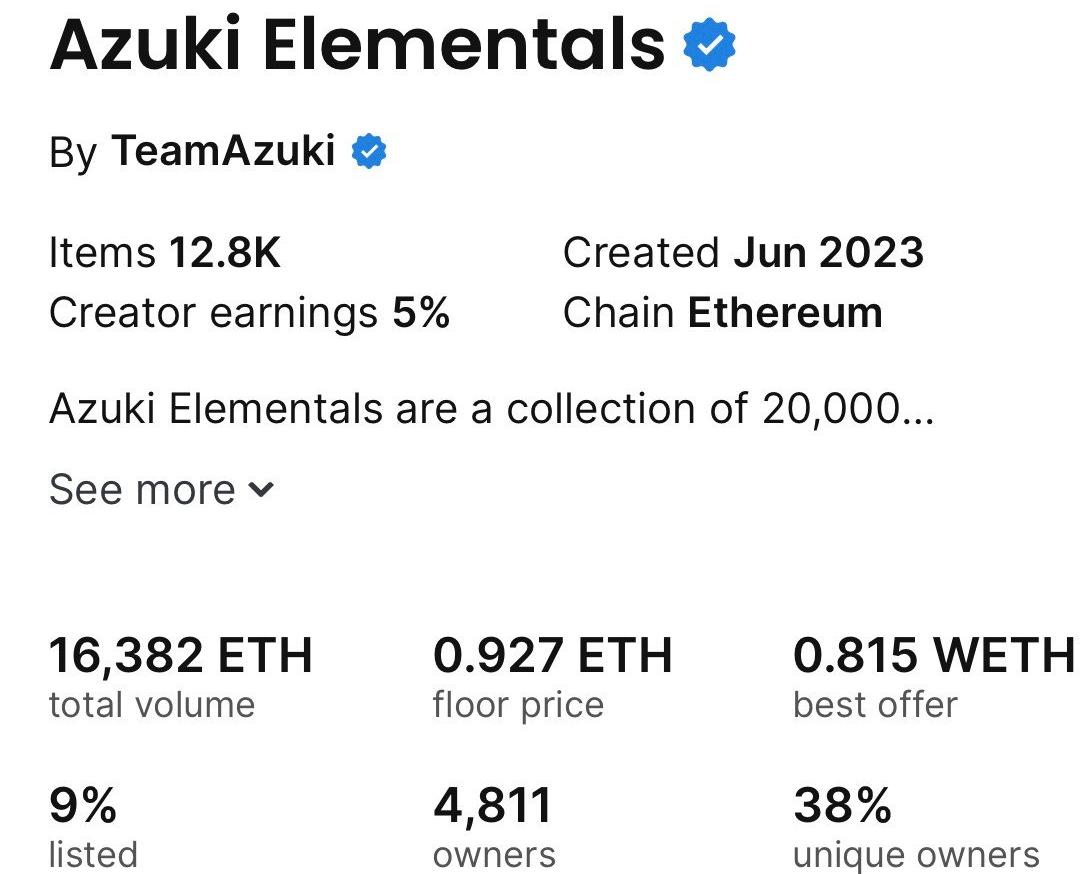 Elementals价格下跌,Azuki的价格也随之下跌。