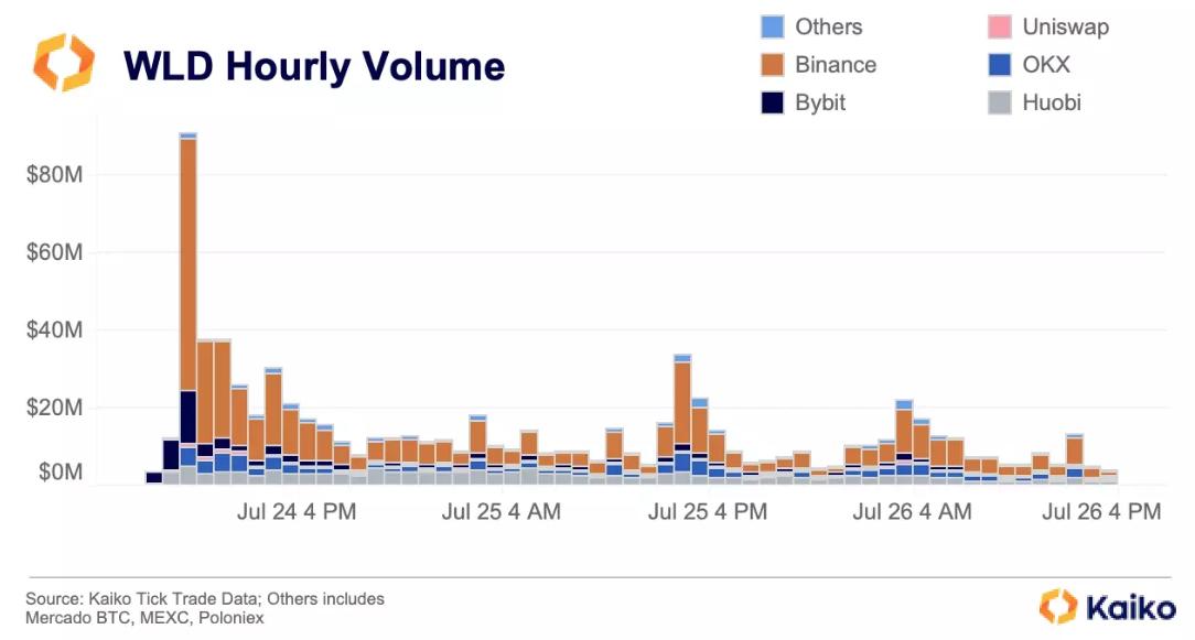 综合起来,可以清楚地看到币安上市如何迅速改变了市场的动态。在头两个小时内,其他交易所的总成交量为1600万美元。币安上市的第一个小时,成交量达到6500万美元,其次是Bybit的1400万美元。与其他交易所相比,火币的每小时成交量保持相对稳定也很有趣。