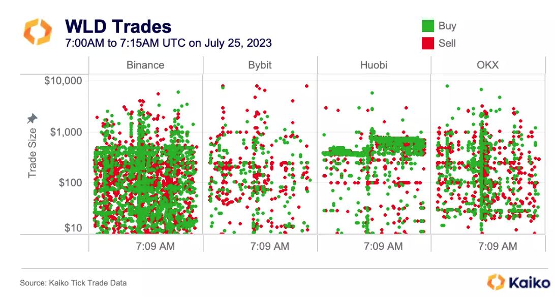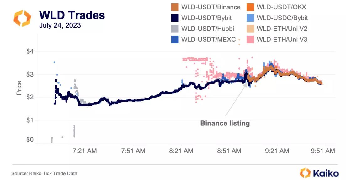 对于这种受到如此高度关注的代币来说,这可能是迄今为止最有秩序的推出。Bybit和火币(Huobi)是最早上市该代币的两家交易所,火币似乎在一开始有几次虚假启动,用底部左侧的灰色圆点表示。然而,一旦火币的交易真正开始,这两家交易所大约在8分钟内趋于一致。