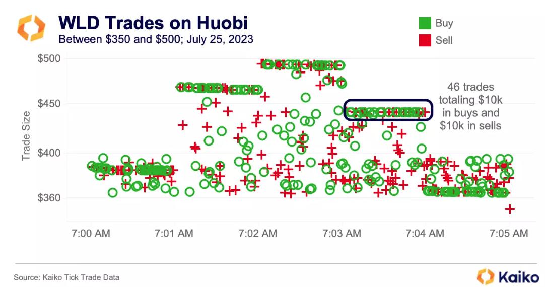 然而,当仔细观察火币交易所时,这些水平聚集并不是TWAP订单;它们在买入和卖出之间完美平衡。过去,我们确定这是人为成交量的一个明显特征。