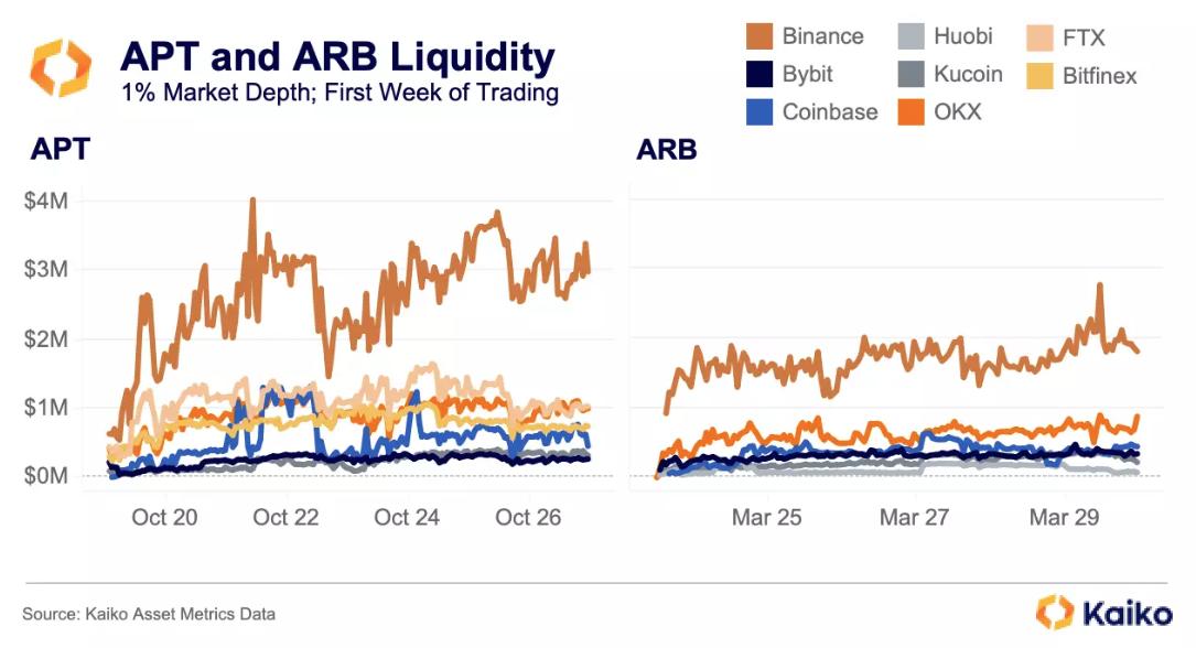 APT的推出正值FTX崩盘之前,导致大量流动性退出市场。因此,在交易的最初几天,APT的流动性激增,币安在上市后的第二天达到275万美元。币安之后是FTX,在大约同一时间达到150万美元。仅仅在上市两天后,APT在1%的水平上的总流动性突破了800万美元。不幸的是,Aptos没有提供与市场制造商的任何安排的详细信息。