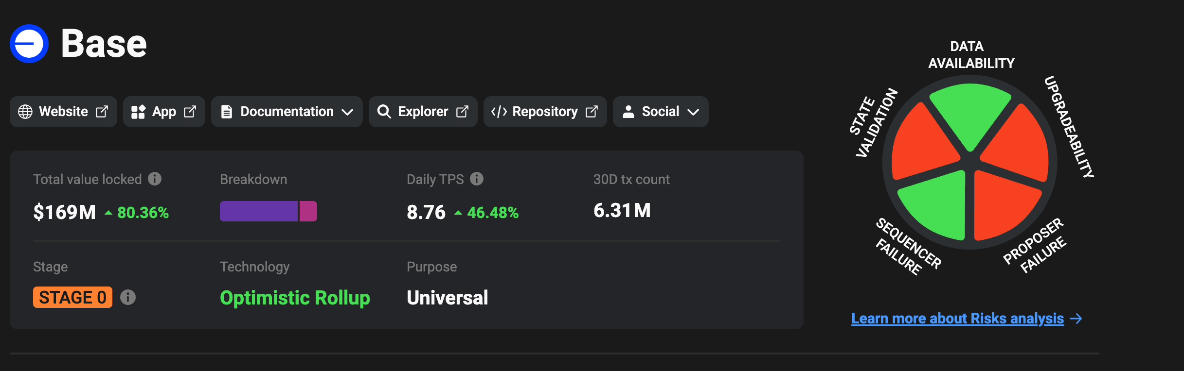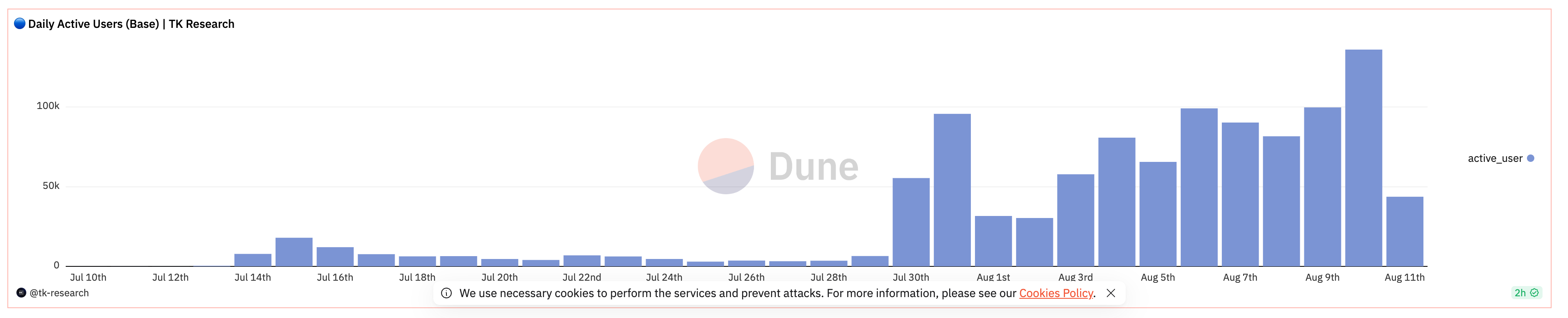 根据 Dune Analytics 数据显示,Base 主网日活跃用户仅上线两天就突破 10 万,在昨(10)日创下 13.6 万的日活跃用户数。而 L2beats 显示,Base 的 TVL 已上升至 1.69 亿美元,增幅超过 80.36%。