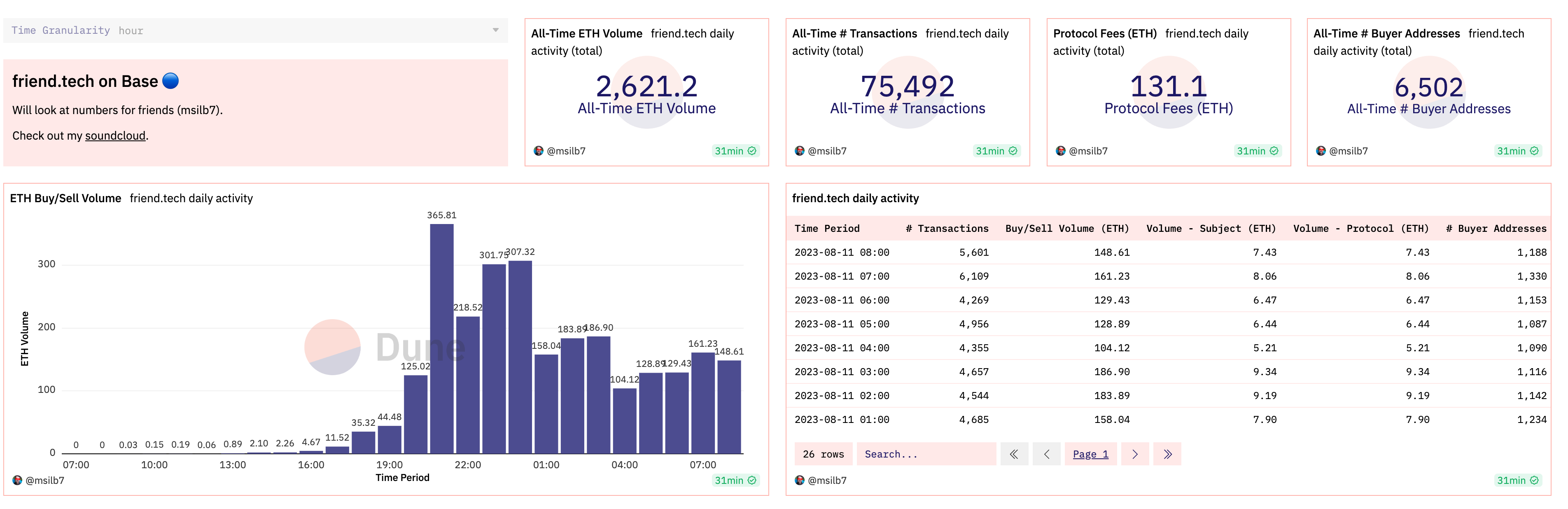 究竟 friend.tech 有多火?Dune Analytics 数据显示,不到一周时间内,Base 链上 Friend.tech 交易额已超 2000 ETH,至截稿前达到 2,621.2 ETH(按照当前价格计算已超 480 万美元)。