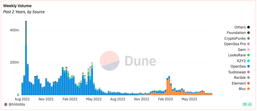 先前曾标榜著创作收益回归于创作者的「NFT」技术,随著时间推进,实际情况似乎变得不同。去年 10 月开始,NFT 交易平台 Blur 横空出世,所有交易平台竞争进入白热化,「零版税」交易也随之盛行,并且各大平台都希望透过降低版税,来增加买气,Messari 的研究分析师 Ally Zach 表示: