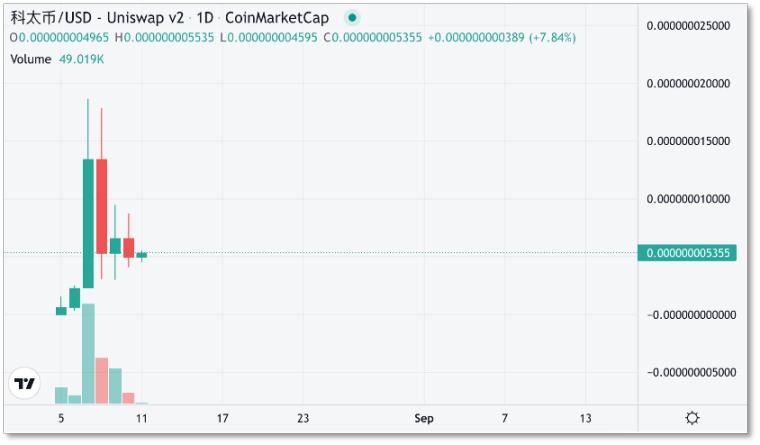 在《孤注一掷》上映首日,科太币已经开始了一波猛跌。Coinmarketcap 数据显示,24 小时内,科太币在链上交易平台 Uniswap 中暴跌 60%。截至 8 月 11 日,科太币持有者仅两千多人。有投资者提示风险,「科太币没有实际价值,流通量很低。如果持币大户抛售离场,崩盘只是一瞬间的事情。」