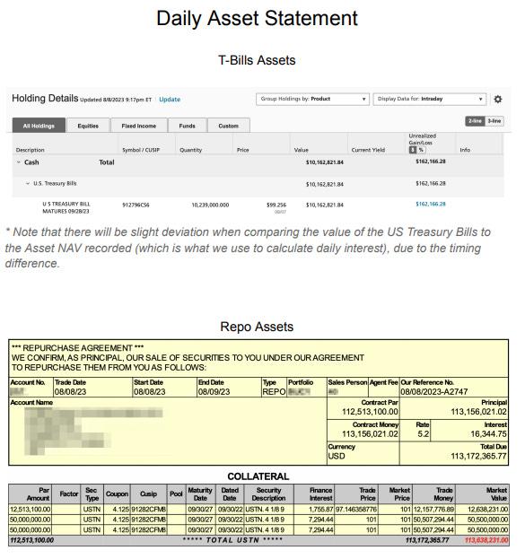 每个工作日,Matrixdock 都会发布准备金证明声明,描述支持 STBT 供应的国库券和逆回购资产之间的分配。 STBT 抵押品目前分为约 90% 的回购协议和 10% 的国库券。考虑到目前的收益率曲线形状和项目的早期状态,这种配置有利于短期回购。
