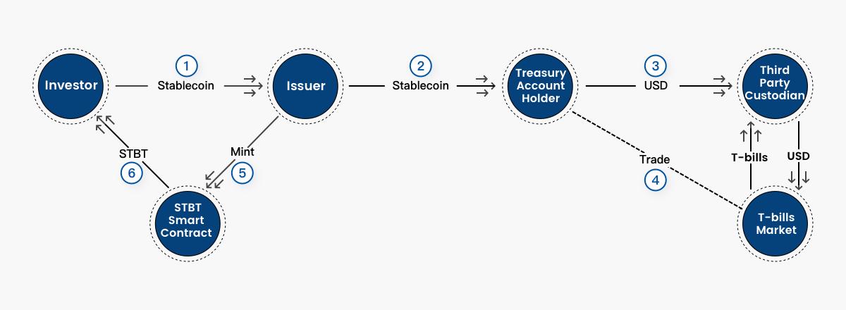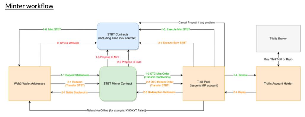 存款验证完成后,发行人将稳定币存款转为由第三方托管人持有的美元。然后将其分配用于购买短期美国国债并建立以这些国债为基础的逆回购协议。因此,等值的 STBT 是新鲜铸造给存款人的。用户通常可以在 3-4 个工作日内在指定地址收到 STBT,并在一周内完成整个过程。