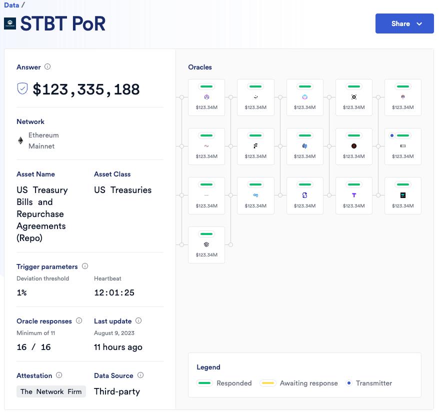 Chainlink 储备证明(PoR)提供STBT 储备的链上估值,旨在确保 STBT 供应总量永远不会超过其储备的美元价值。数据由 Matrixdock 的第三方审计公司The Network Firm LLP提供给 Chainlink,该公司直接从托管合作伙伴的 API 收集数据并计算资产净值 (NAV)。