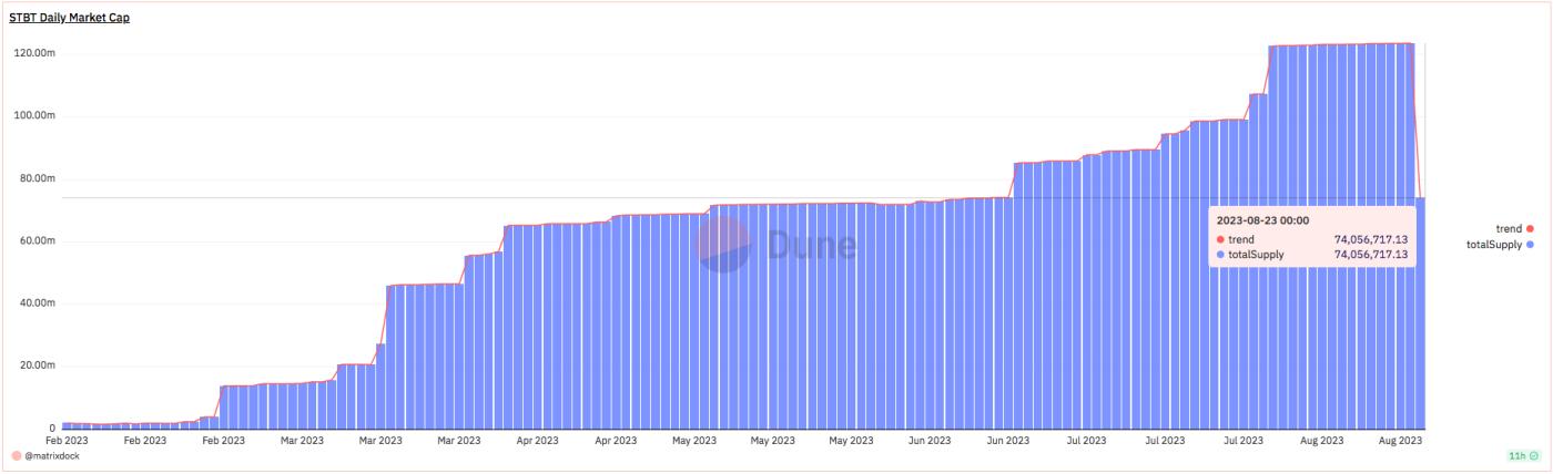 根据此STBT Dune 查询,截至 2023 年 8 月 17 日,代币生命周期内已发生 190 个铸币事件。在铸造事件中,有 59 个独特地址铸造了 STBT。