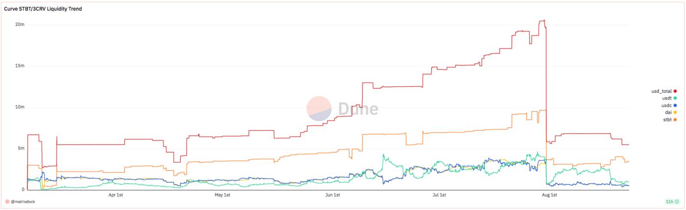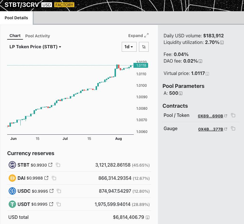 STBT 与STBT-3CRV稳定互换池中的 3CRV 配对,截至 2023 年 8 月上旬,包含约 680 万美元的资产。STBT 的曲线指标提案于 2023 年 3 月提交, DAO 投票以 92.9% 的速度通过。